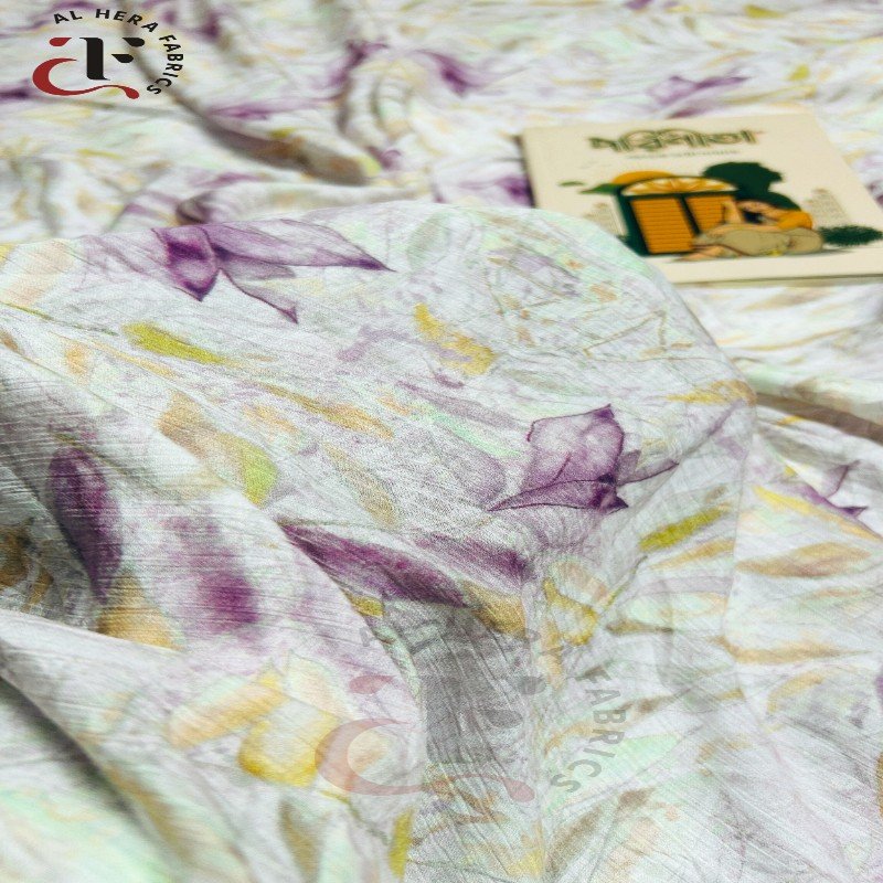 Experience the tranquil elegance of our Lavender Dreams Leaf Print Maisha Cotton. The crisp, breathable texture of Maisha Cotton drapes beautifully, making it a perfect choice for flowing garments. The pattern is a sophisticated watercolor leaf motif, blending deep plum, soft lavender, and pale green hues against an airy off-white base. This artistic print is perfect for crafting statement pieces like flowing kurtas, anarkalis, or contemporary blouses that capture a serene, natural aesthetic.