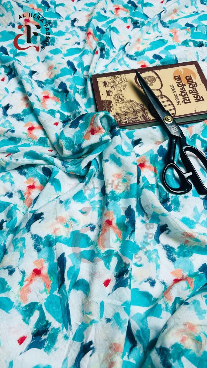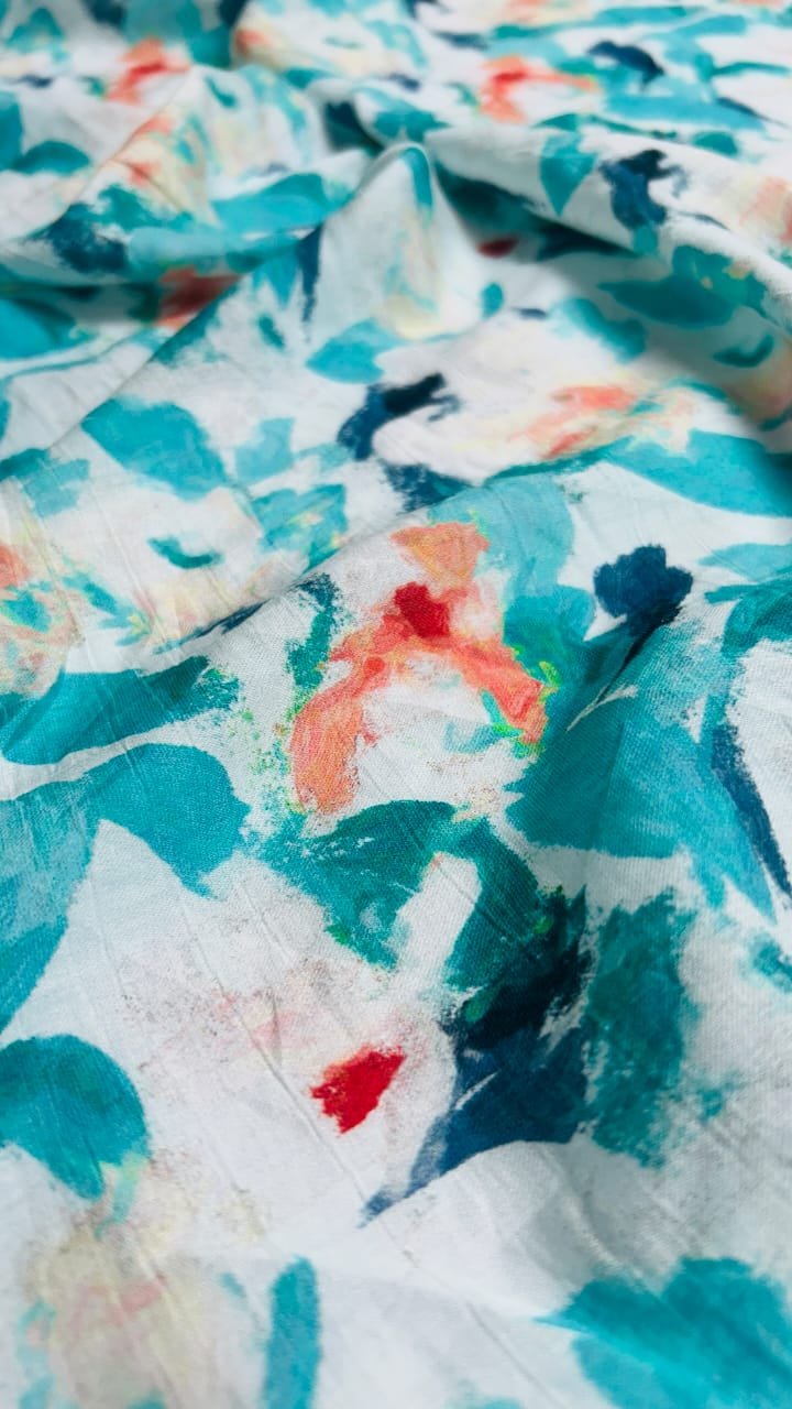 Bring a touch of art to your wardrobe with this vibrant Maisha Cotton Print Fabric. It features a modern abstract brushstroke design in refreshing shades of Aqua, Teal, and Navy, highlighted by cheerful pops of Coral. Soft, breathable, and comfortable cotton—perfect for everyday kurtas, summer apparel, children's wear, and home décor accents.