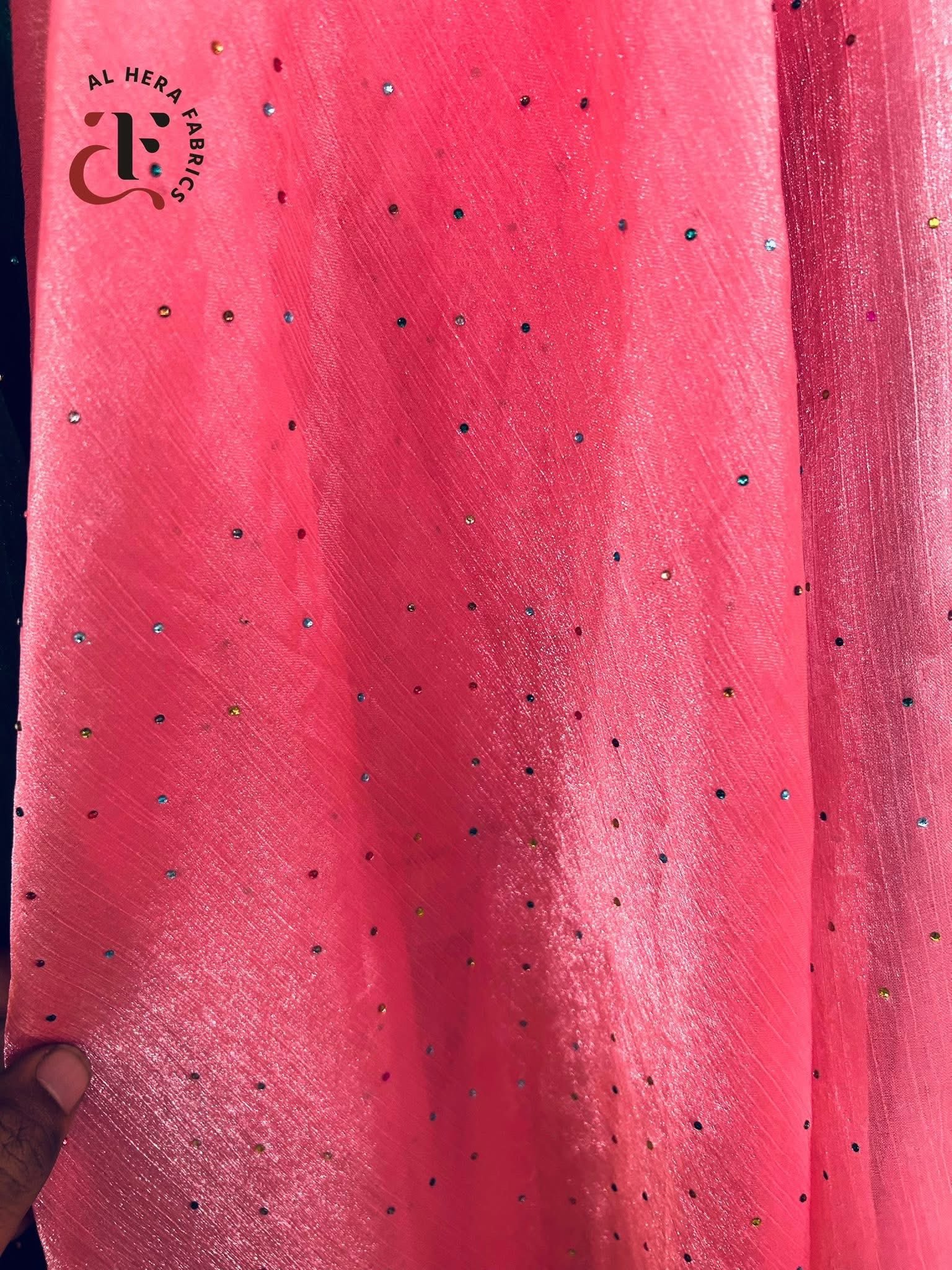 Elevate your fashion statement with our Premium Zimichu Million Stone Fabric. This exquisite material combines a luxurious, high-shine shimmer base with a galaxy of tiny, multicolored "Million Stones" that catch the light from every angle.