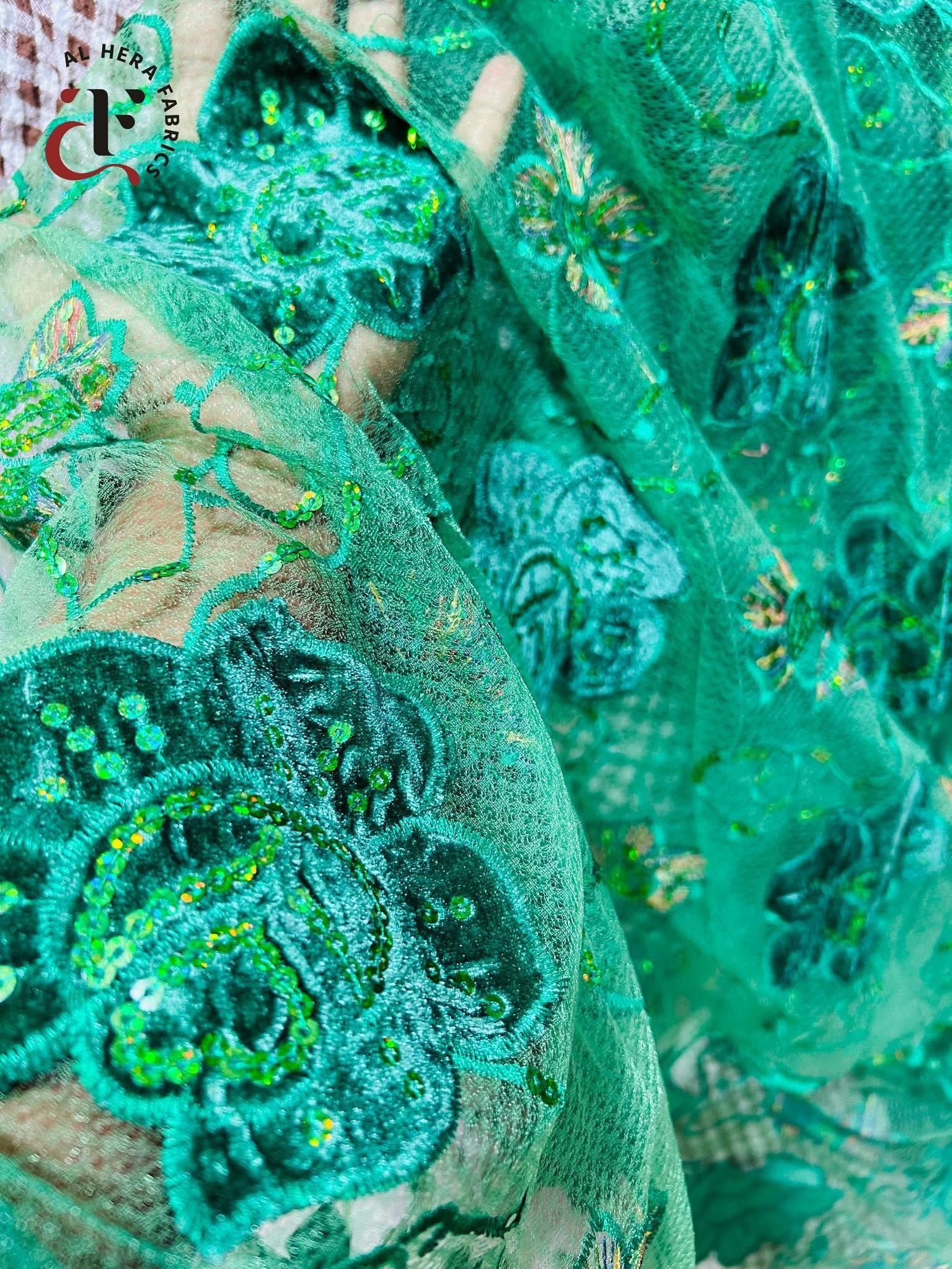 Royal Emerald Velvet Rose & Sequin Soft Net Organdi