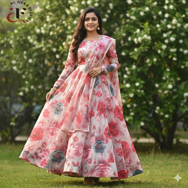 Indulge in the romance of this sheer Tissue Print fabric, featuring large, dramatic roses in shades of crimson red and deep pink. Contrasting slate-grey accents give it a sophisticated edge. The crisp drape and vivid colours make this a perfect choice for striking dupattas, elegant blouses, and glamorous evening attire.