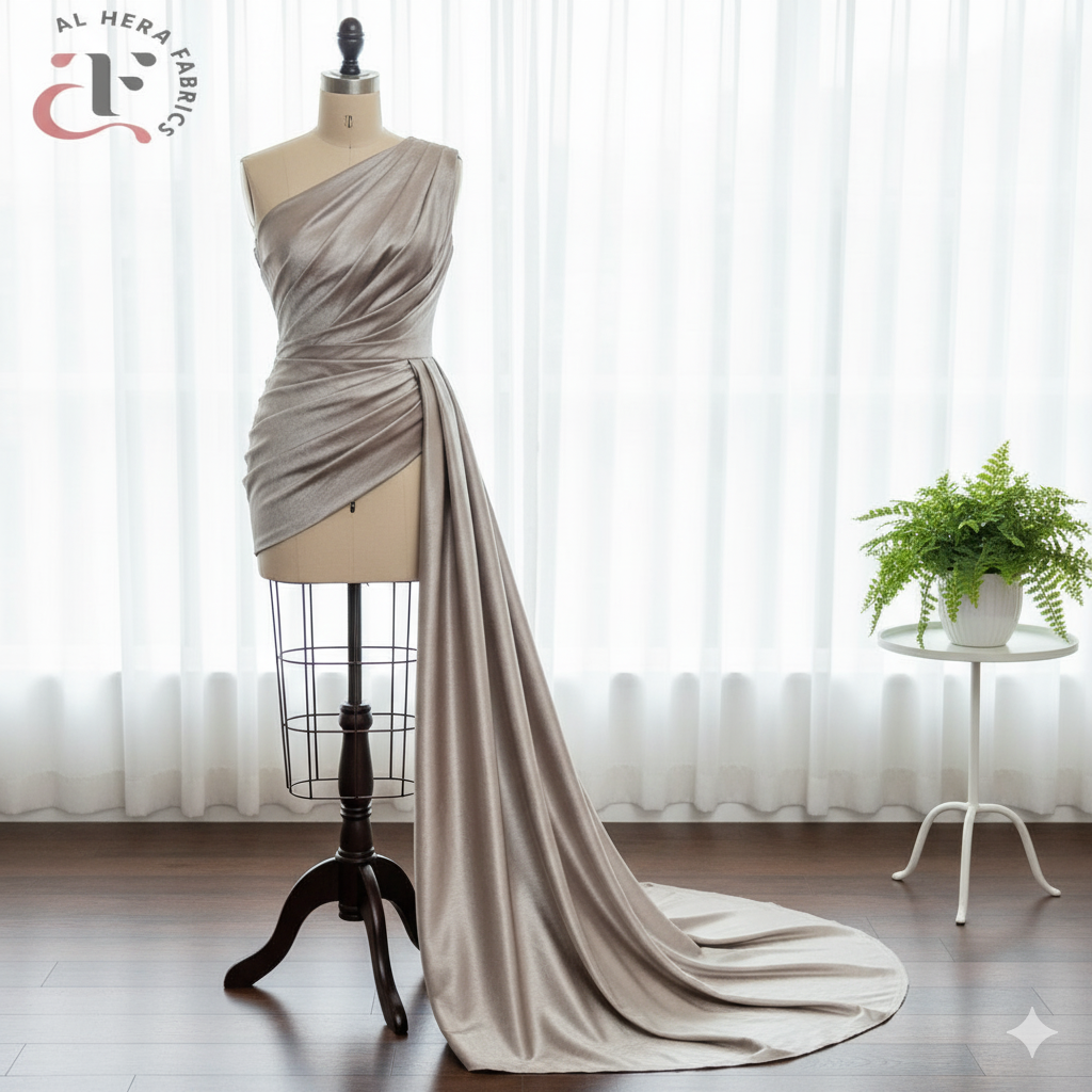 Discover timeless elegance with this Smoky Quartz Dubai Silk. This luxurious fabric blends cool taupe and grey with a beautiful luminous sheen and the signature crinkle texture, offering a refined drape perfect for sophisticated custom apparel.