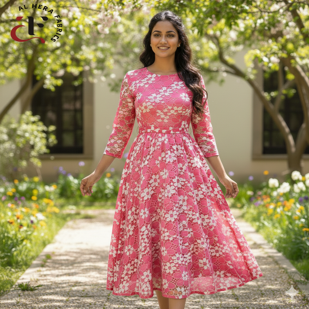 Styling Tip: This lace is bold enough to be used as a simple overlay on a solid lining (like white, black, or matching pink) or can be incorporated as dramatic sleeves or panels.