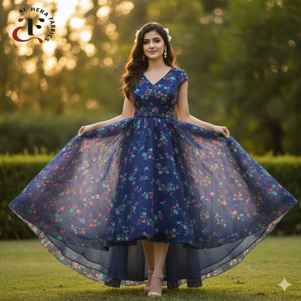 This high-quality georgette is lightweight, offers an exceptional fluid drape, and is an excellent choice for crafting glamorous sarees, evening anarkalis, stylish dresses, and elegant blouses. This fabric combines a formal, regal color with a sweet, feminine print, making it perfect for any special occasion.