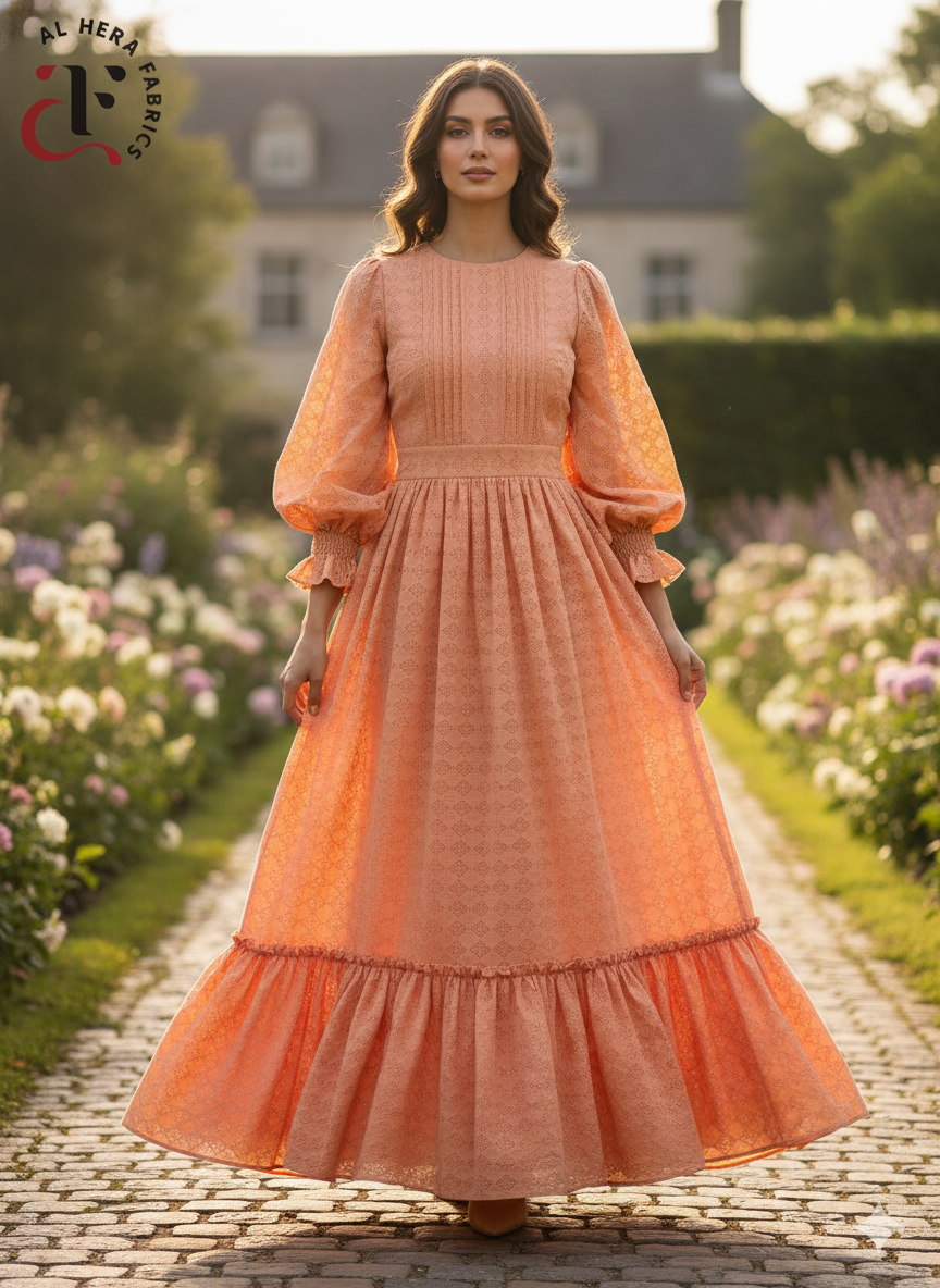 Elevate your wardrobe with our exquisite Soft Peach Chicken Cotton Eyelet Fabric. Known for its delicate texture and exceptional breathability, this fabric is the ideal choice for warm-weather tailoring.